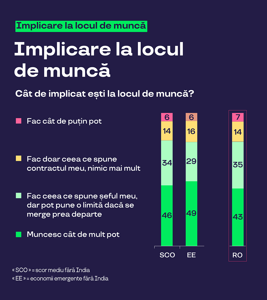 - 46% spun că “muncesc cât de mult pot” (43% în România), în timp ce 34% îndeplinesc așteptările, dar stabilesc limite atunci când este necesar (35% în România)