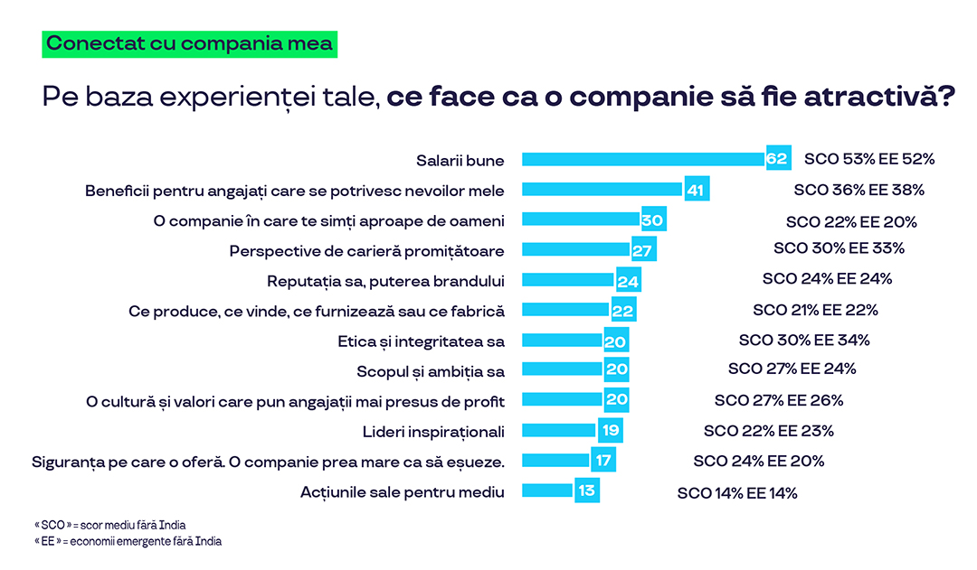 Pentru companii și organizații, această schimbare reprezintă o oportunitate majoră. Conform studiului, angajații sunt atrași de angajatori care îndeplinesc trei așteptări cheie: creștere și autonomie, conexiuni umane și o atmosferă pozitivă la locul de muncă, precum și beneficii materiale (salariu, beneficii, etc.).