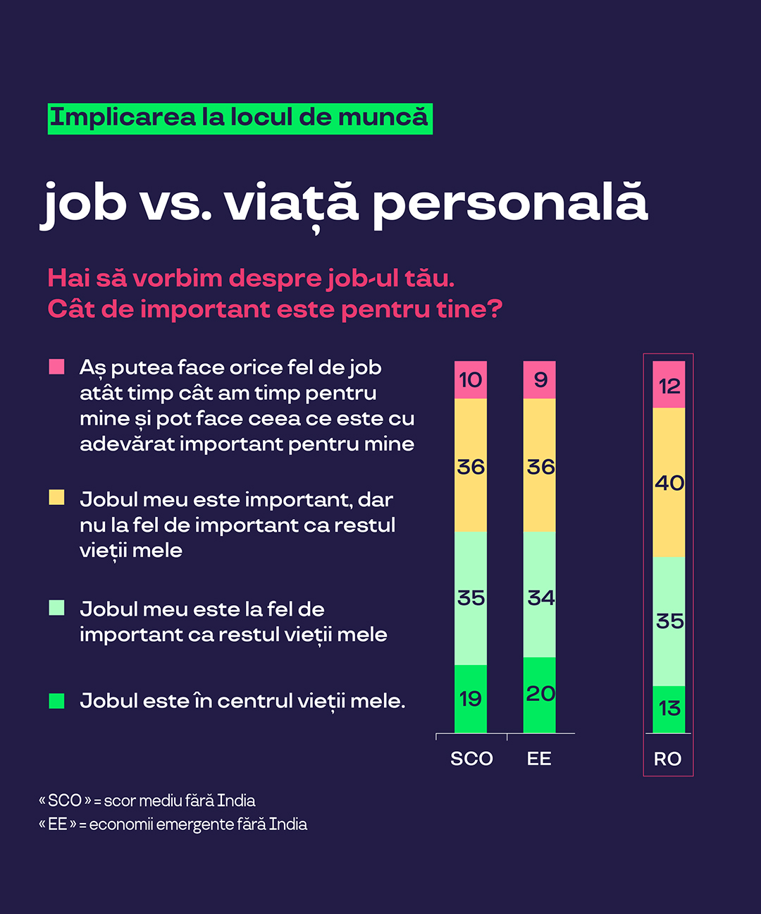 - 19% dintre angajații din întreaga lume plasează locul de muncă în centrul vieții lor (13% în România), în timp ce 35% consideră că job-ul este la fel de important ca restul vieții lor (35% în România)