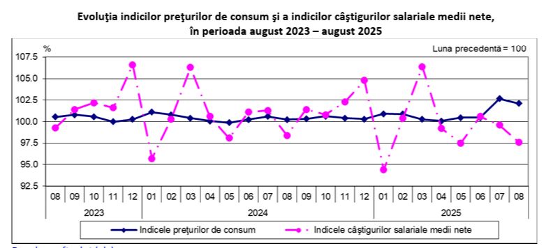 Indicele câștigului salarial real a fost 95% în luna august 2025 față de august 2024. Indicele câștigului salarial real a fost 95,6% în luna august 2025 față de luna iulie 2025. Raportat la luna octombrie 1990, indicele câștigului salarial real a fost 236,4%, cu 10,8 puncte procentuale mai mic decât cel înregistrat în luna iulie 2025.