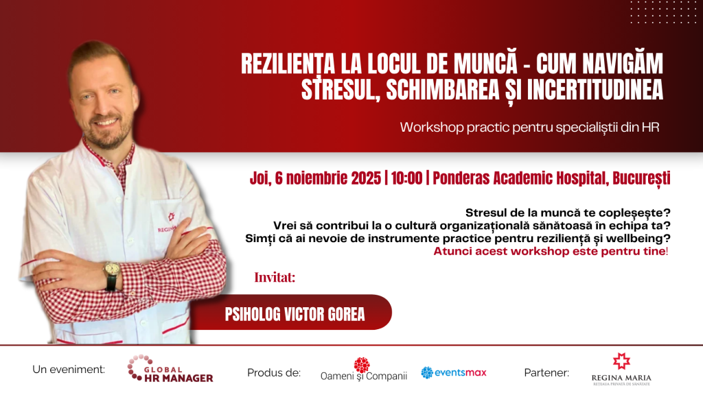 Astfel, pe 6 noiembrie, la Ponderas Academic Hospital din București, are loc o nouă întâlnire a comunității OSC-GlobalHRManager sub forma unui workshop practic dedicat specialiștilor din Resurse Umane intitulat Reziliența la locul de muncă – Cum navigăm stresul, schimbarea și incertitudinea.